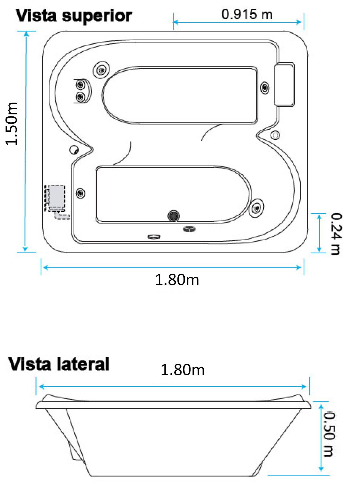 Descripción: Tina Doble modelo Samoa  con Sistema de Hidromasaje, 4 jets dirigibles