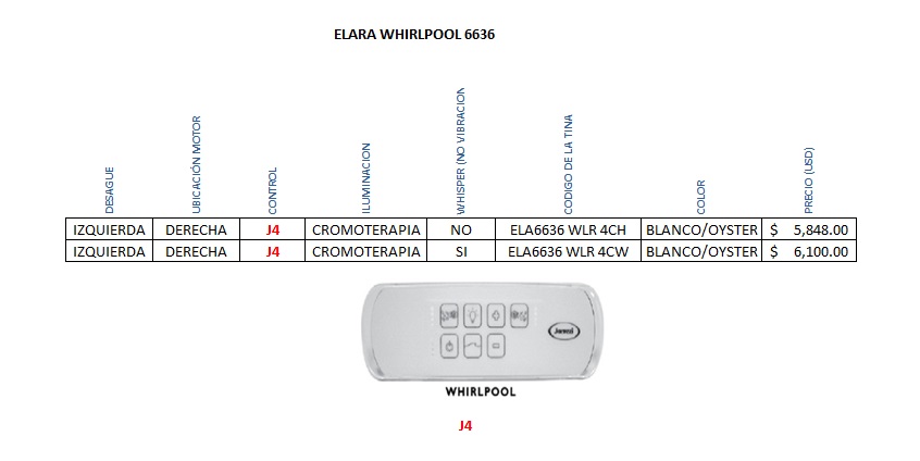 Descripción: Sistema de hidromasaje Elara que incluye 4 jets TheraPro